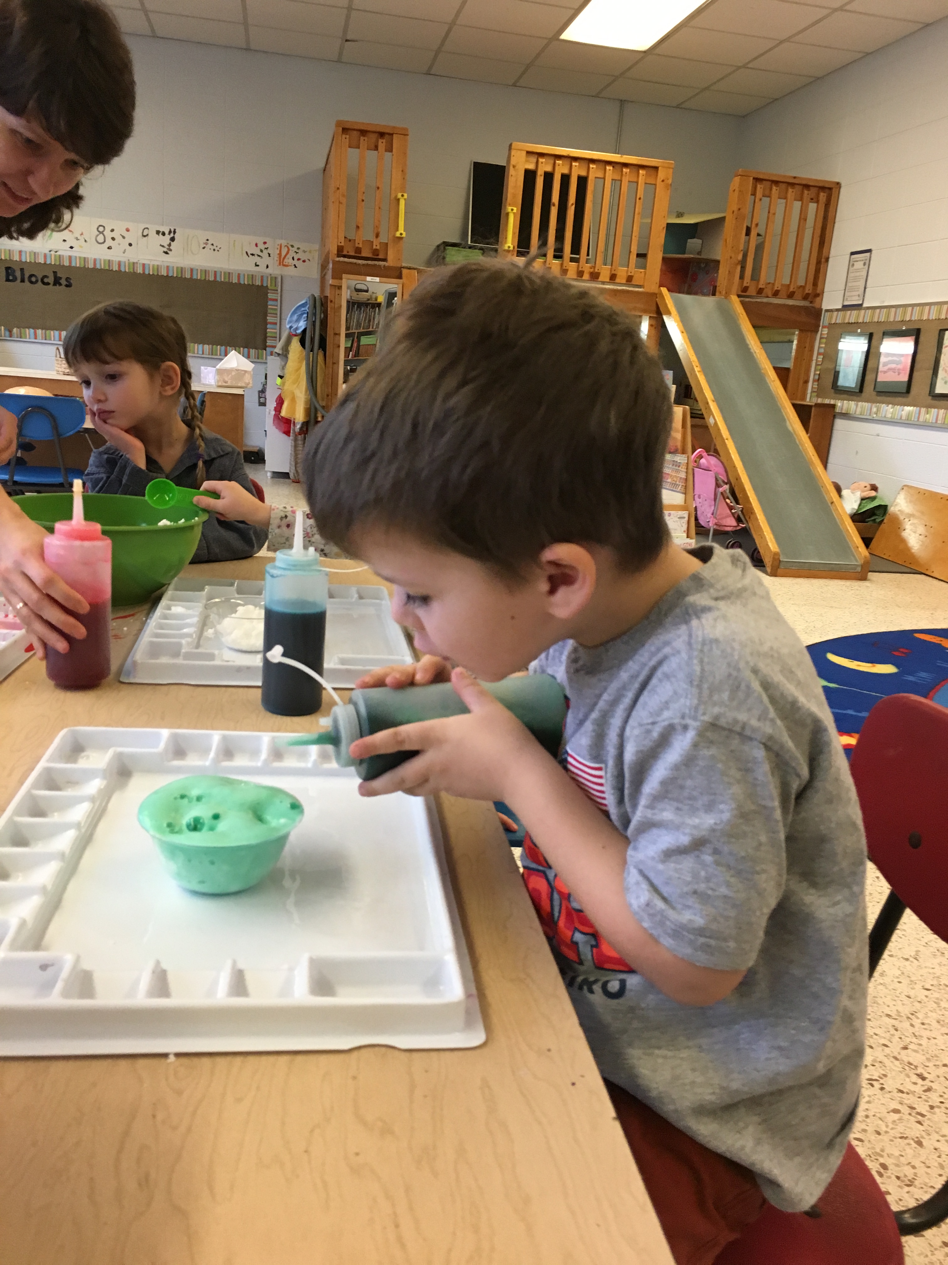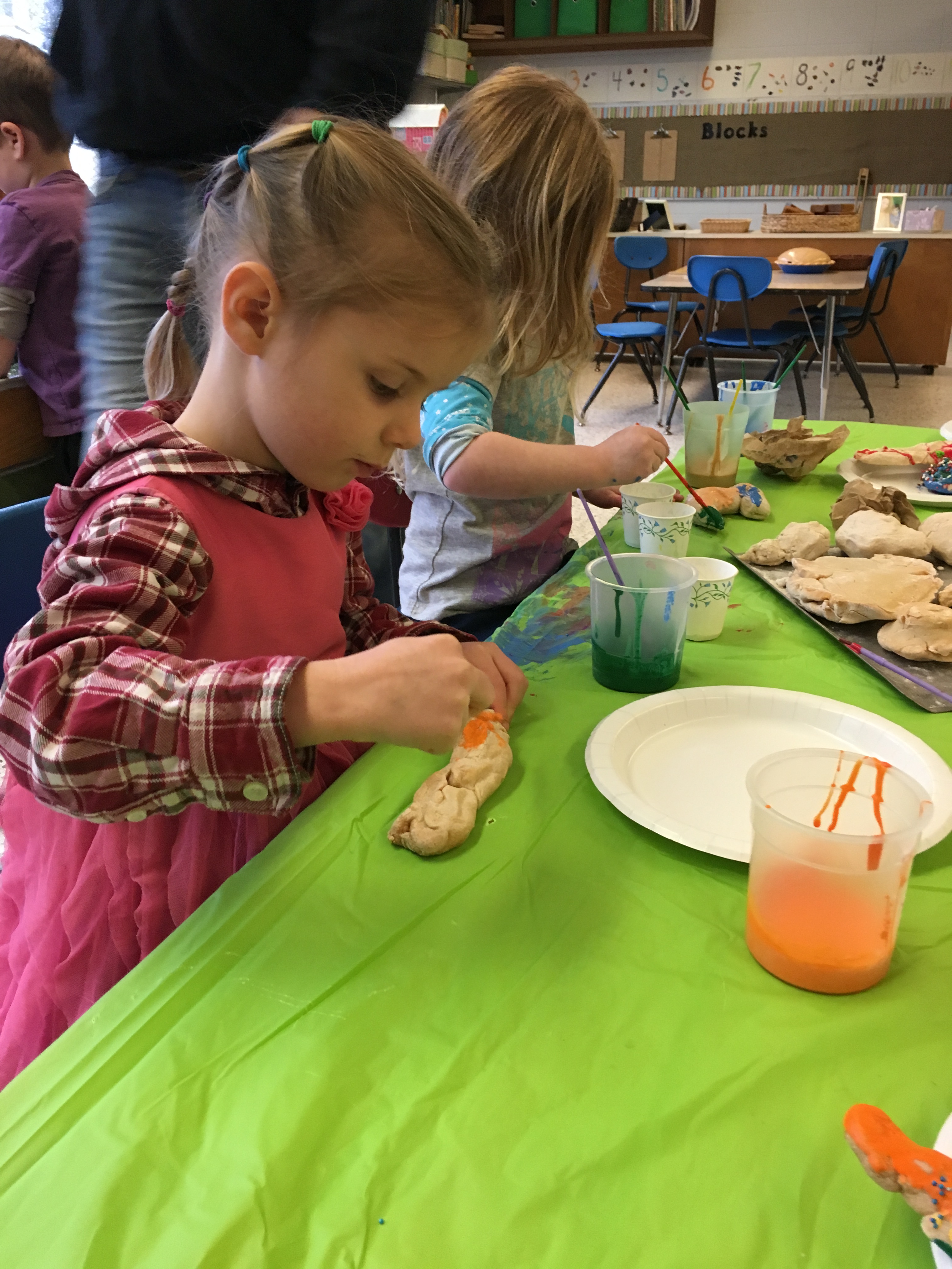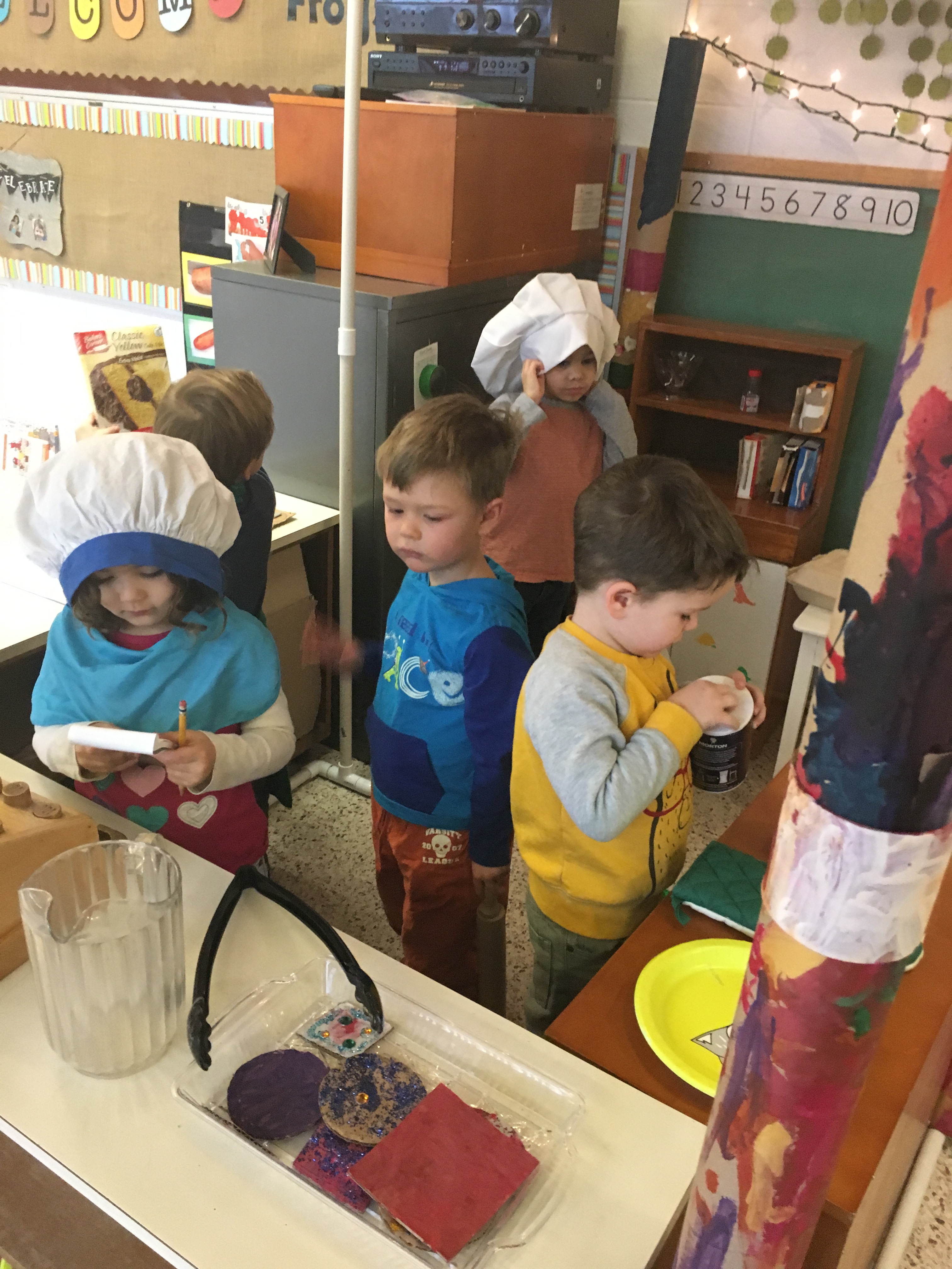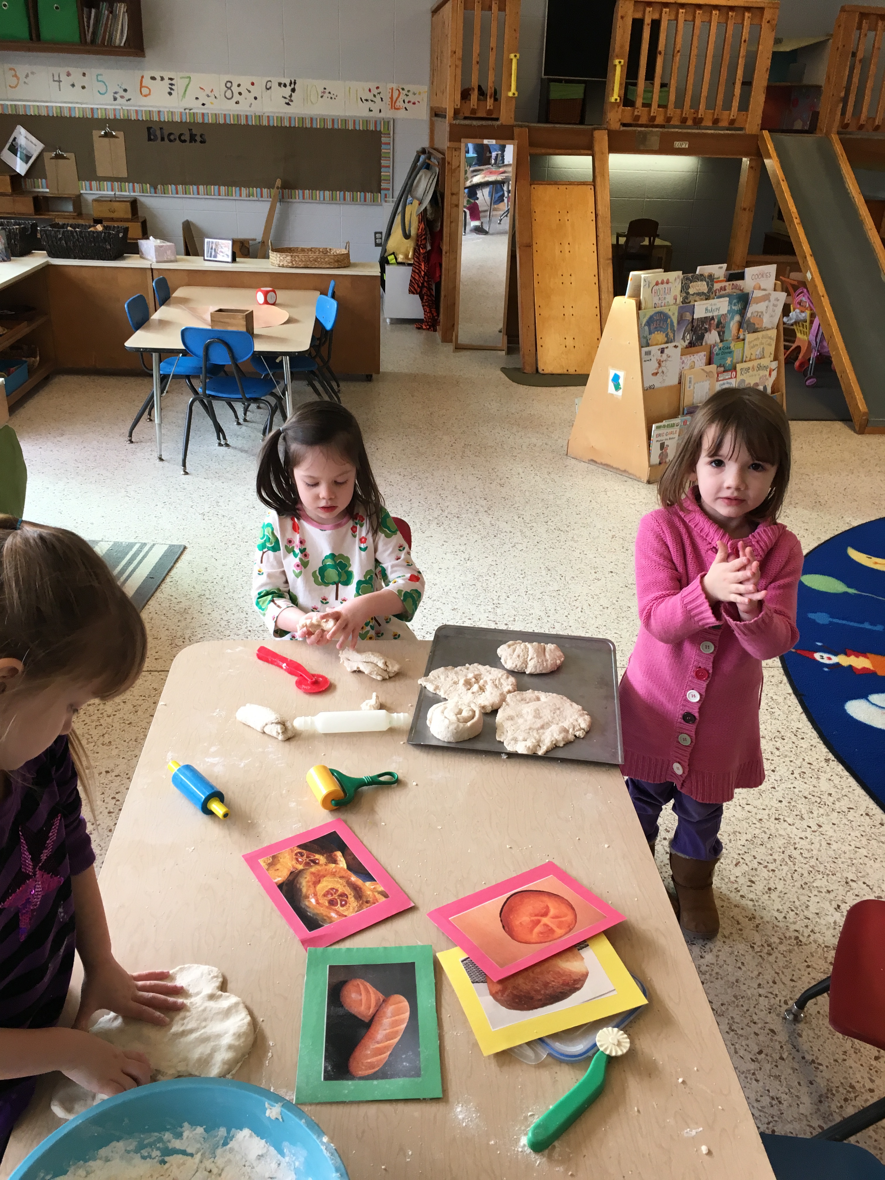Both Polliwog and Frog classes have spent the month of January exploring baking and bakeries. The children brainstormed quite a list of information that they had already experienced, or previously knew, about bakeries. After the list was started, and continued to grow as more books were read, the “creation” piece took off!